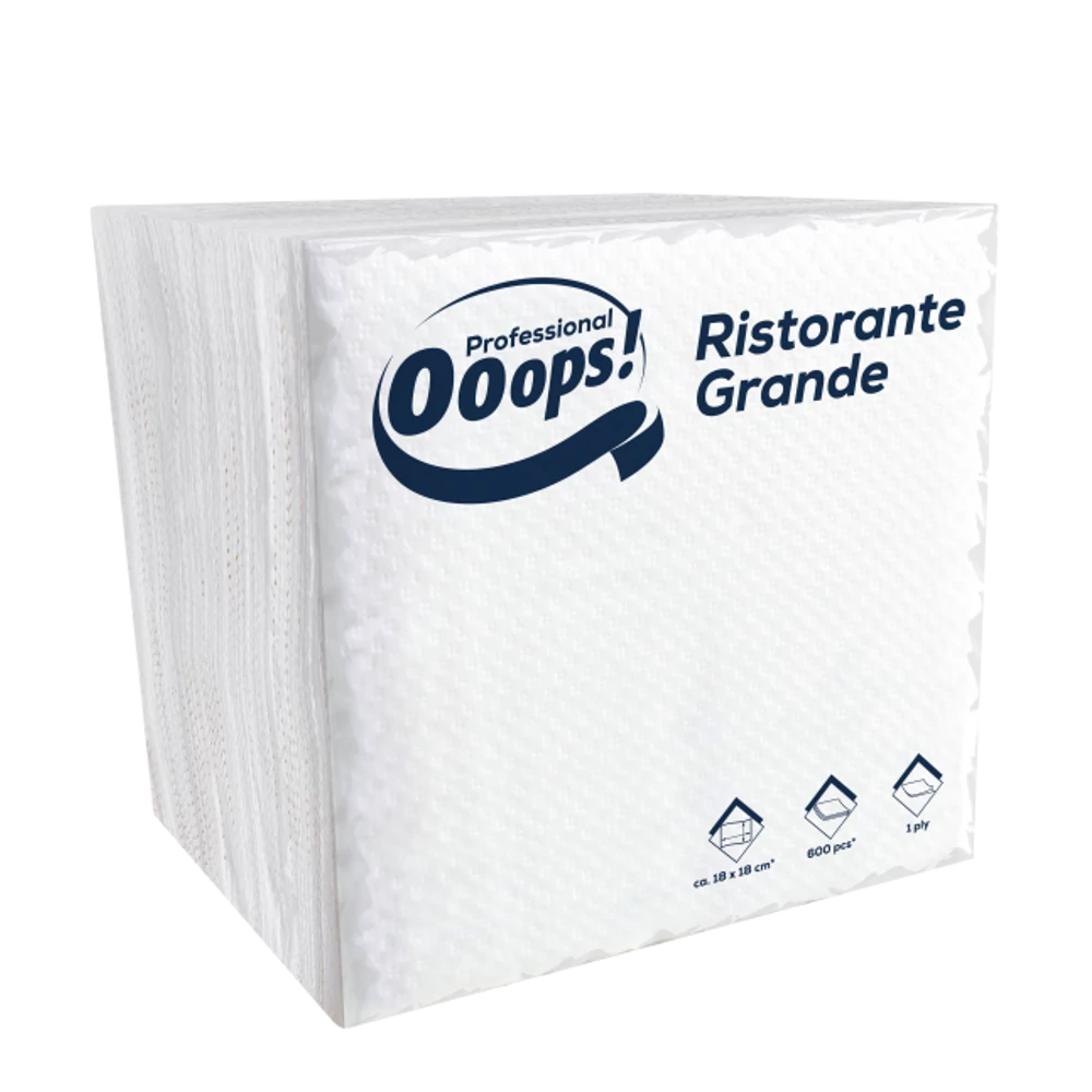 A korábbi MILYO éttermi szalvéta utódja az Ooops! Ristorante Grande egy klasszikus hajtás nélküli fehér a teljes felületén prégelt éttermi szalvéta. Nagyobb méret, vastagabb lapok. Ideális megoldás kifőzdékben, bárokban, büfékben és gyorséttermekben egyaránt.